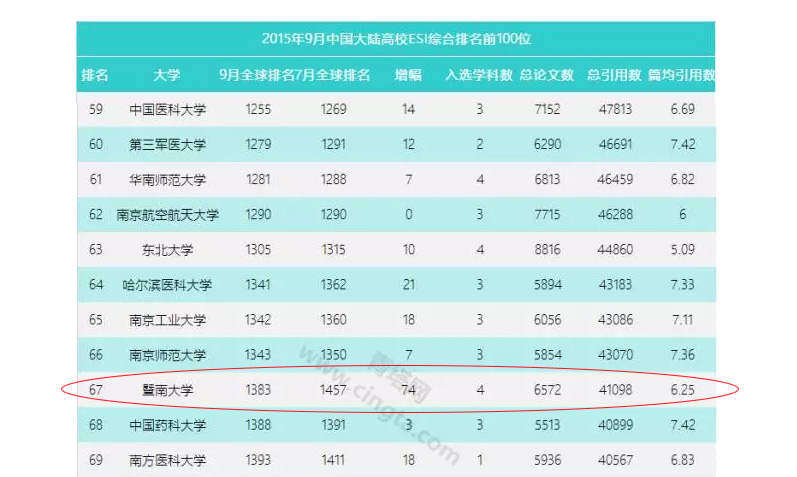 9月14日,ESI中国高校百强榜出炉,暨南大学名列全国第67,全球第1383名,较今年7月疯狂前进了74名,进步速度较各大高校快。