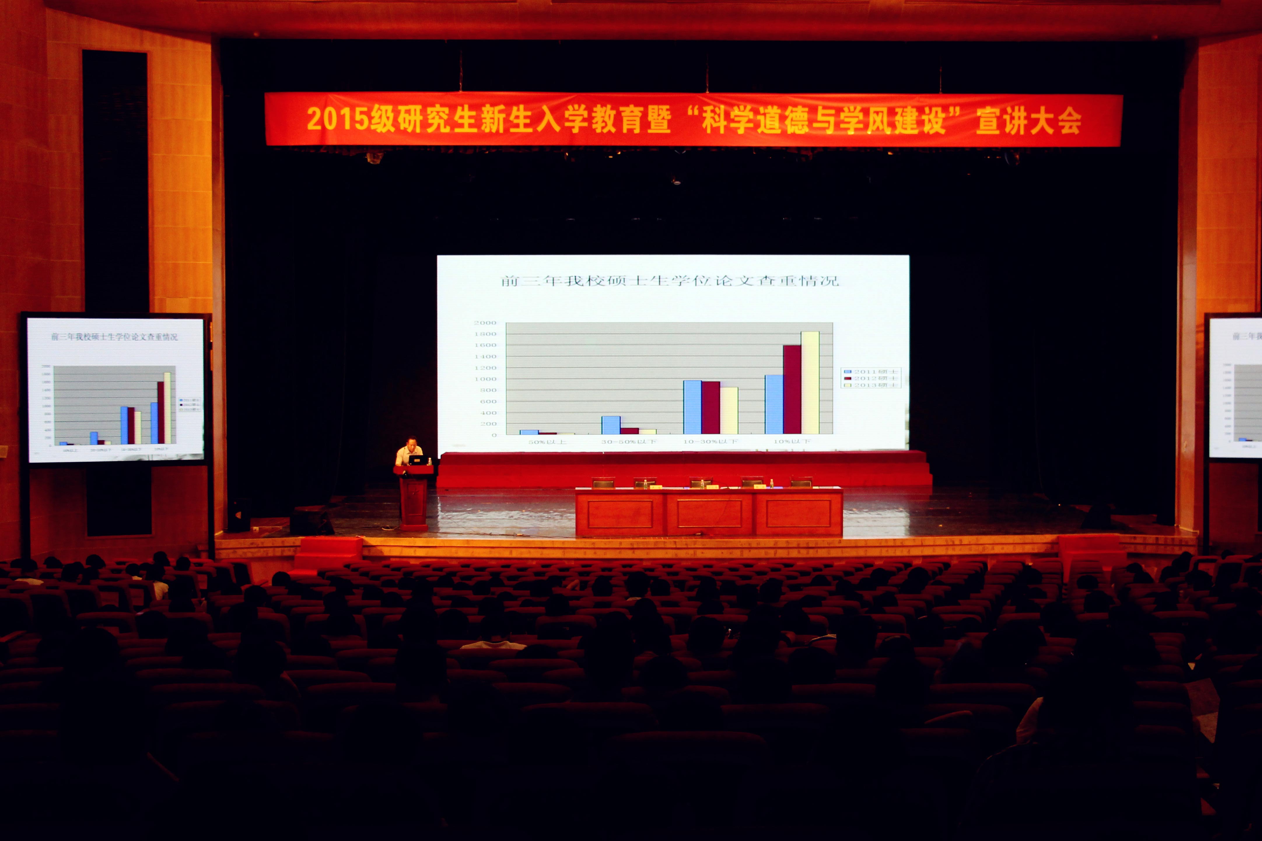 9月17日,暨南大学2015级研究生新生入学教育暨“科学道德与学风建设”宣讲大会在礼堂举行。副校长林如鹏、研究生院执行院长张宏、党委研究生工作部部长卢远出席,全体2015级研究生新生参加大会。