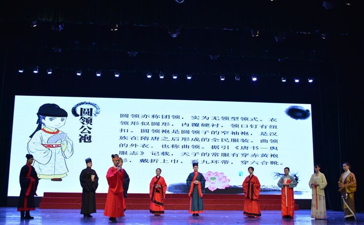接下来,一场中华传统服饰文化的视觉盛宴在礼堂里呈现:华丽庄重的秦汉曲裾;色彩艳丽的唐朝高腰儒裙;文质彬彬的大唐圆领公袍;风流倜傥的明朝道袍……依次登场,引来一阵阵赞叹。