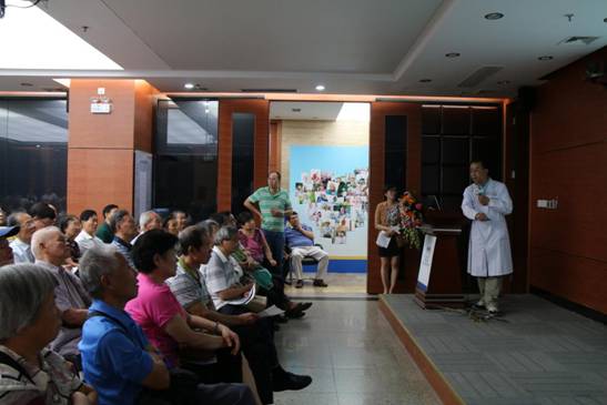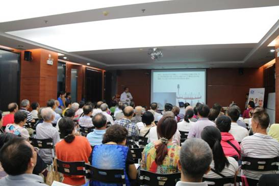 由于场地座位有限,晚到的市民站在门口认真听讲座