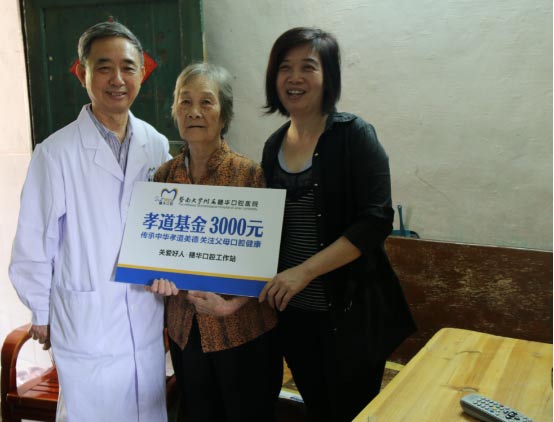 今天义诊日,暨南大学附属口腔医院为传承中华孝道美德,同时落实贯彻落实由广州市天河区文明委、广州市文明办、天河好人志愿服务队、穗华口腔医院联合主办“微笑广州大型口腔健康公益行”活动,特为孤寡、独居以及失独老人送去慰问金3000元,也同时呼吁子女“传承中华美德、关注父母口腔健康”,希望天下的老人都老有所依、老有所乐。
