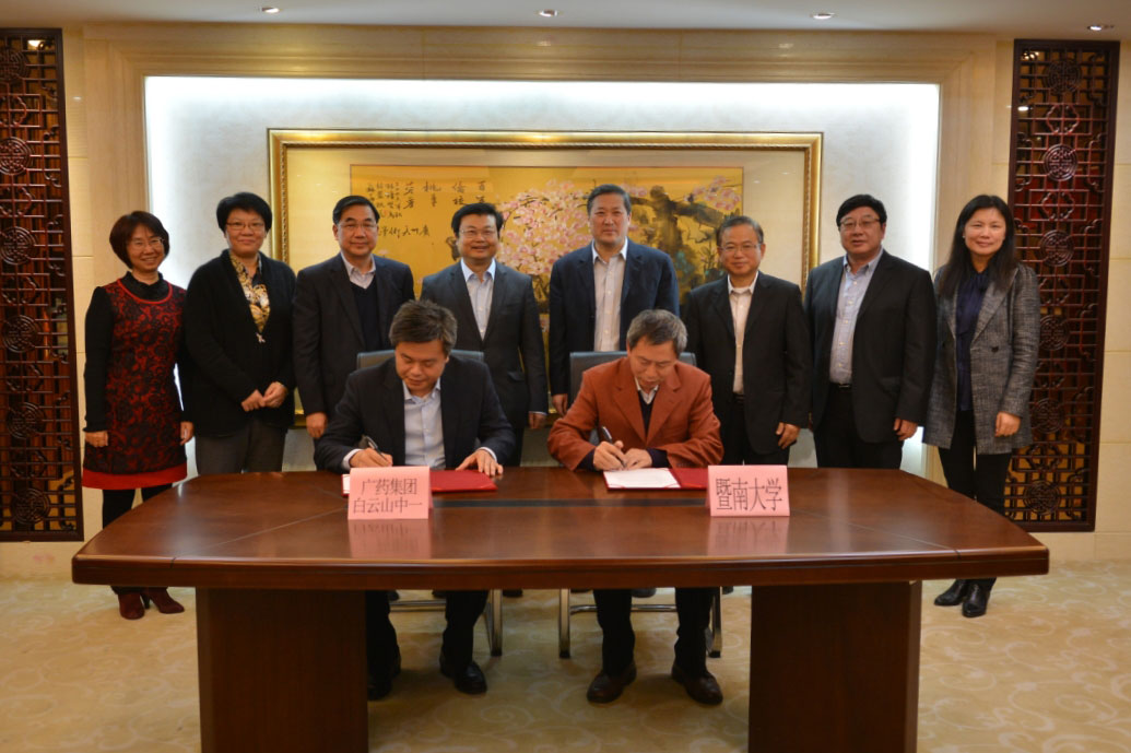 胡军、李楚源共同为“暨南大学白云山中一现代中药研究院”揭牌,刘洁生和陈矛代表双方签订了《广州医药集团-暨南大学战略合作框架协议》,药学院副院长陈卫民与广州白云山医药集团副总经理、中一药业董事长张春波代表双方签订《安宫牛黄丸防治中风的药效学评价及机理研究合作意向书》,研究院首期合作项目正式启动。
