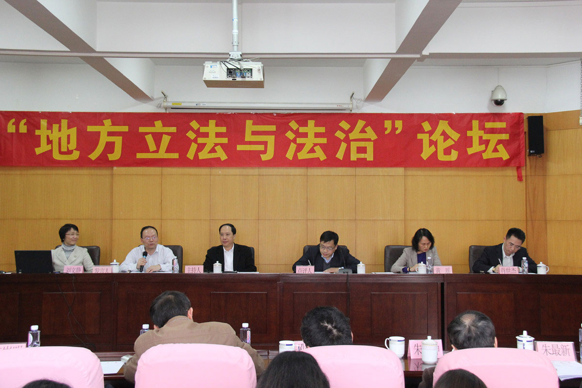 广东省人大常委会副主任肖志恒、校长胡军分别致辞,广东省依法治省领导小组办公室常务副主任陈岸明和广东省人大常委会法制工作委员会主任王波主持主题讨论。