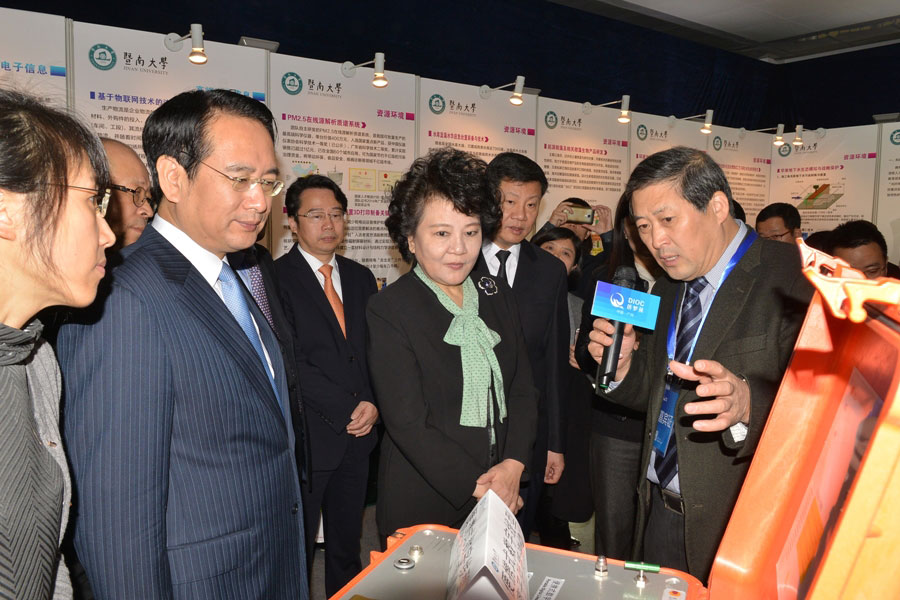 在“侨梦苑”创新中心举办了创新创业成果展,充分展示了学校高层次创新人才队伍、重点创新平台,在高端电子、资源环境、高端装备、创新药物、食品和包装工程、医疗器械等领域取得的一批科技创新成果;同时还展示了在海外学生培养和大学生创新创业驿站建设成果及校友资源情况等。裘援平和陈建华在展厅听取了具体项目介绍和相关工作汇报,并对取得的成绩表示了肯定。
