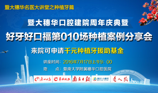 种植牙被称为人类第三副牙齿,已成为公认的有效的缺牙修复方式。它在填补缺失牙齿的同时,又不损伤相邻的牙齿,使用起来和真牙几乎无异。然而不少人对于种植牙的了解甚微,对种植牙也心存疑惑:种植牙是怎么种的?种进去疼不疼?到底是不是可以使用40年甚至是终身?为此,2016年7月17日,穗华口腔医院特别推出《穗华口腔医院建院周年庆典暨好牙好口福第010场种植案例分享会》,将由公立三甲医院种植专家为广大缺牙者作详细解答,同时享受种植牙公益援助优惠,让缺牙者拥有好牙好口福。