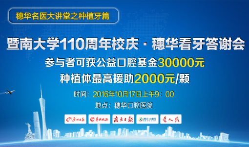 暨南大学始于1906年清政府创立于南京的暨南学堂,2016年是建校110周年校庆,穗华口腔医院传承浓厚的学科底蕴,凭借先进的诊疗技术、强大的综合实力,并肩负着高度的社会责任感,正盛大展开《暨南大学110周年校庆·穗华口腔看牙答谢会》活动,热烈庆祝暨南大学110周年校庆,同时回馈社会大众。