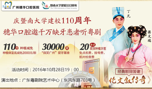 2016年10月28日,由广州穗华口腔医院主办、广东粤剧院艺术中心承办的“庆暨南大学建校110周年——穗华口腔邀千名缺牙患者听粤剧”主题活动将在穗隆重开锣!表演曲目是由广东粤剧院原创、中国戏剧梅花奖获得者
