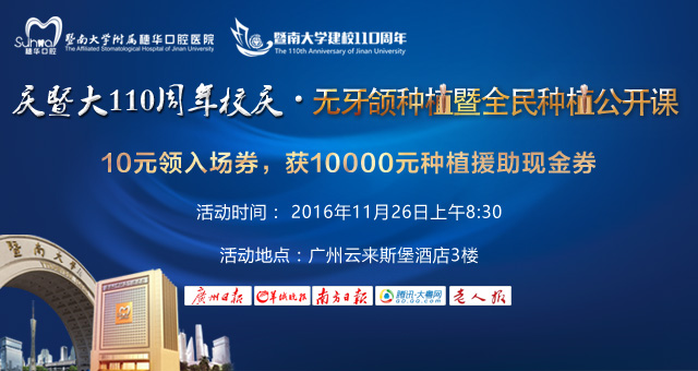 近日,暨南大学将迎来110周年校庆,作为暨南大学附属的穗华口腔医院在这校庆之际,举办“无牙颌种植峰会暨全民种植公开课”,届时将有20余位三甲种植专家莅临现场为广大市民现场直播高难度种植公开课,并为大家解答种植牙方面的问题。