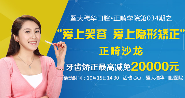一次隐形牙齿矫正,让你无形中悄然变美,还你灿烂的笑容,让你爱上笑容。10月15日14:30,穗华口腔医院·正畸学院第034期之“爱上笑容 爱上隐形矫正”正畸沙龙强势来袭 ,助歪牙改“斜”归正,让你爱上笑容,爱上隐形矫正!