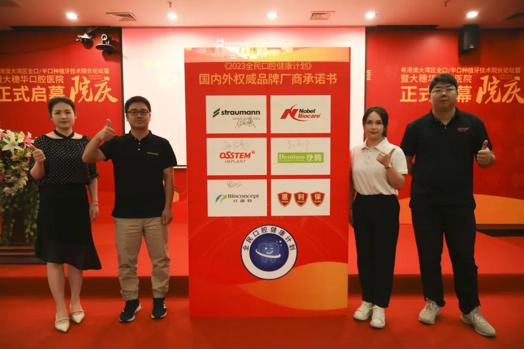 穗华口腔医院始终致力人类口腔健康、全身健康的医疗事业,积极响应百姓省钱种牙的呼声及国家集采政策的落地,联合士卓曼、诺保科、登腾、百康特、奥齿泰这五大种植厂商,推行种植牙集采项目,让每位缺牙人都能重获健康牙,不再有价格之忧。本次活动五大种植厂商现场签署【诚信诊疗】承诺书,为广大患者提供放心、满意的医疗服务和产品。