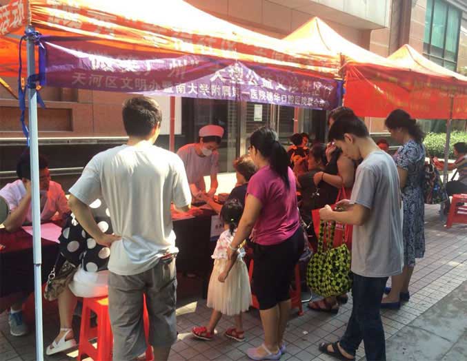 2015年8月8日,穗华口腔医院“微笑广州”公益义诊活动再度延续,穗华口腔公益医疗团队来到越秀区东风二社区,开展“微笑广州”公益义诊活动,为居民们提供免费的口腔检查、身体检查、口腔咨询等,为宣传口腔健康常识,提高居民们口腔保健意识起到了不可忽视的作用。